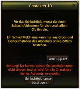 - Κατά την πρώτη είσοδό σου καθορίζεις το όνομά σου για το πεδίο μάχης. Προσοχή: Το όνομα αυτό ισχύει για ολόκληρο το λογαριασμό. Θα το χρησιμοποιείς με κάθε χαρακτήρα που εισέρχεται στο πεδίο μάχης. Γι' αυτό διάλεξέ το προσεκτικά!!